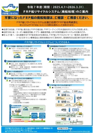 一般社団法人 日本マリン事業協会主催のFRP船リサイクルシステムに参加しております。小型船なら引取から廃船処理までご相談下さい。パンフレット料金表も常備しております。